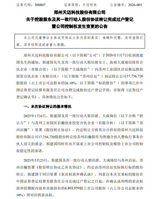 1月7日,天迈科技(300807.SZ)公告,公司控股股东郭建国及其一致行动人郭田甜、海南大成瑞信投资合伙企业(有限合伙)(以下简称“大成瑞信”)向苏州工业园区启辰衡远股权投资合伙企业(有限合伙)(以下简称“苏州启辰”)协议转让17756720股股份(占公司总股本的26.10%)的事项,已于2026年1月6日在中国证券登记结算有限责任公司完成过户登记手续。