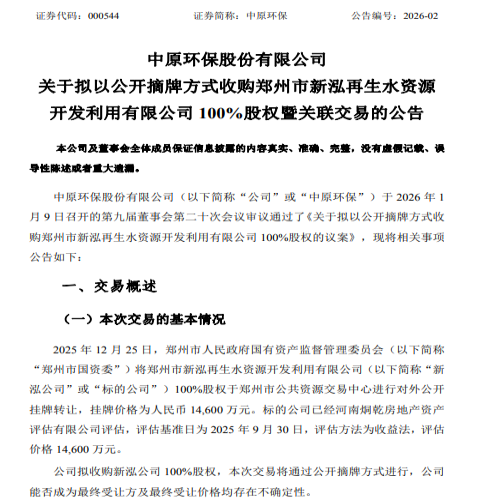 中原环保在2025年12月25日发布的公告中称,该公司按要求向郑州市公共资源交易中心递交了报名资料,近日,根据郑州市公共资源交易中心通知,确认中原环保为标的资产受让方,交易价格14.57亿元。