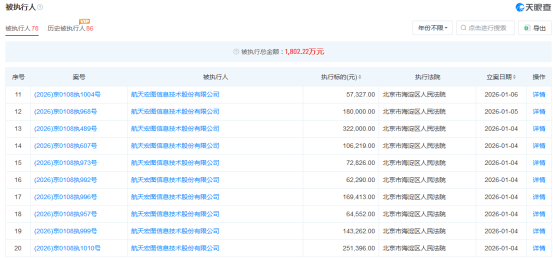 天眼查显示,航天宏图共有被执行人记录78条,金额共计1822万元,最新一次被列入被执行人的是北京市海淀区人民法院于2026年1月12日发布的《(2026)京0108执956号》,被执行标的29.70万元。早在2025年12月30日,北京市海淀区人民法院发布了对航天宏图实控人、董事长王翔宇的《限制消费令》。