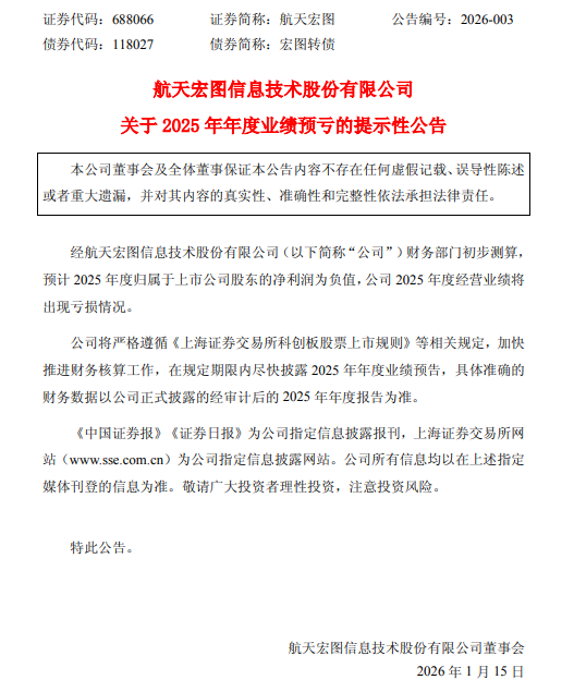 1月15日,航天宏图信息技术股份有限公司(688066.SH,以下简称:航天宏图)发布2025年度业绩预亏的提示性公告。