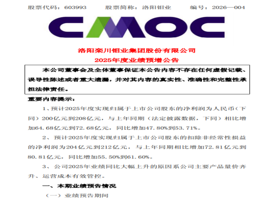 1月15日,洛阳钼业披露2025年业绩预告,预计2025年度实现归属净利润为200亿元到208亿元,与上年同期相比增加64.68亿元到72.68亿元,同比增加47.8%到53.71%;预计2025年度实现扣非净利润为204亿元到212亿元,与上年同期相比增加72.81亿元到80.81亿元,同比增加55.5%到61.6%。