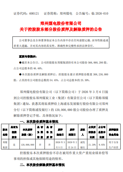 【香港经济导报网讯】3月10日晚间,郑州煤电股份有限公司(证券简称:郑州煤电 600121.SH)发布公告称,控股股东郑州煤炭工业(集团)有限责任公司于3月5日将1.2亿股公司股份质押给上海浦东发展银行股份有限公司郑州分行,质押期限三年,融资用于自身生产经营。同日,郑煤集团解除了原质押给该行的1.2亿股股份。本次质押完成后,郑煤集团累计质押股份3.08亿股,占其持股总数的54.45%,占公司总股本的25.30%。