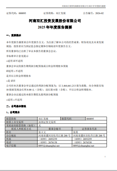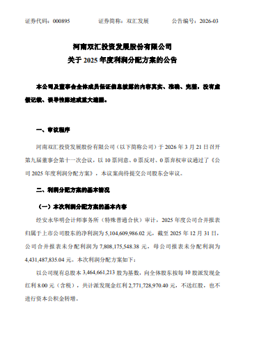 【香港经济导报网讯】3月24日,河南双汇投资发展股份有限公司(证券简称:双汇发展 000895.SZ)2025年年度报告披露,2025年实现营业收入592.74亿元,归属于上市公司股东的净利润51.05亿元,拟向全体股东每10股派发现金红利8.00元,合计派发约27.72亿元。