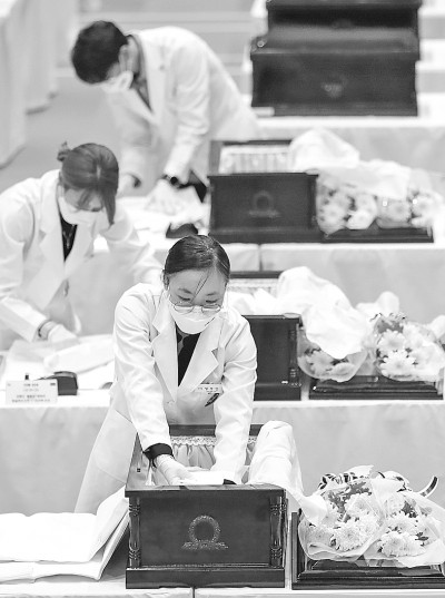 9月26日,在韩国仁川,韩方工作人员将志愿军烈士遗骸入殓。新华社记者 王婧嫱摄